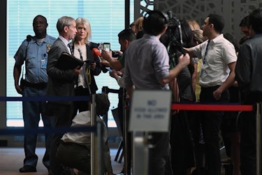 Olof Skoog, som her snakker med pressen, var president i Sikkerhetsrådet fra januar 2017 til juli 2018. I 2019 ble han utnevnt til EUs FN-ambassadør.