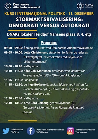 Hvert år har Den norske Atlanterhavskomité gleden av å invitere til dagskurs i internasjonal politikk rundt om i Norge. Årets kurs har fått tittelen «Stormaktsrivalisering: Demokrati versus autokrati».