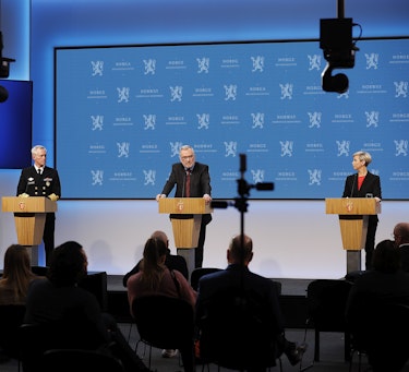 Fremleggelsen av FOKUS 2022 i Oslo 11. februar 2022. F.v: Sjef Etterretningstjenesten, viseadmiral Nils Andreas Stensønes, sjef Politiets sikkerhetstjeneste, Hans Sverre Sjøvold, og sjef Nasjonal sikkerhetsmyndighet, Sofie Nystrøm.